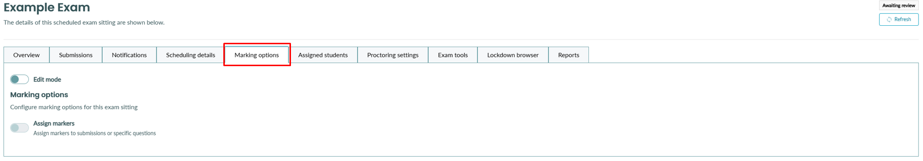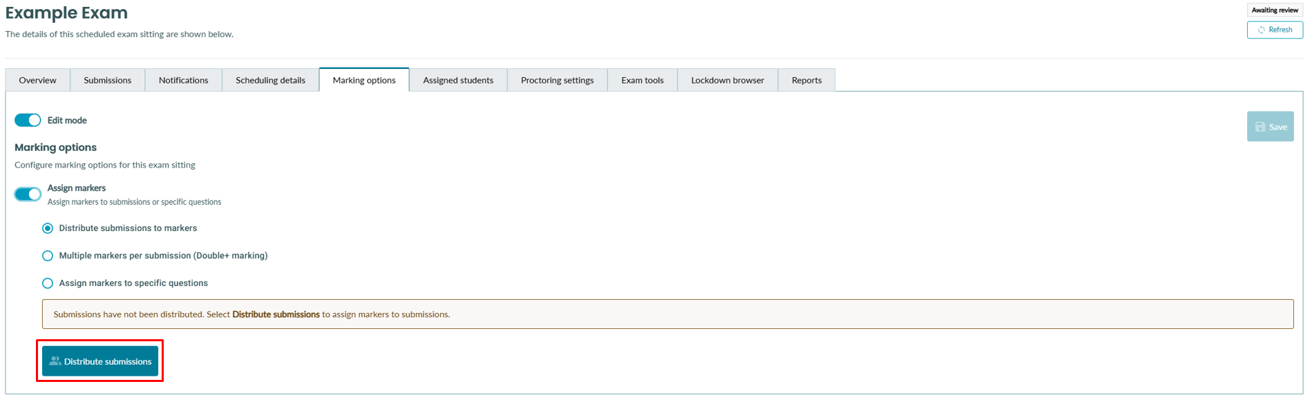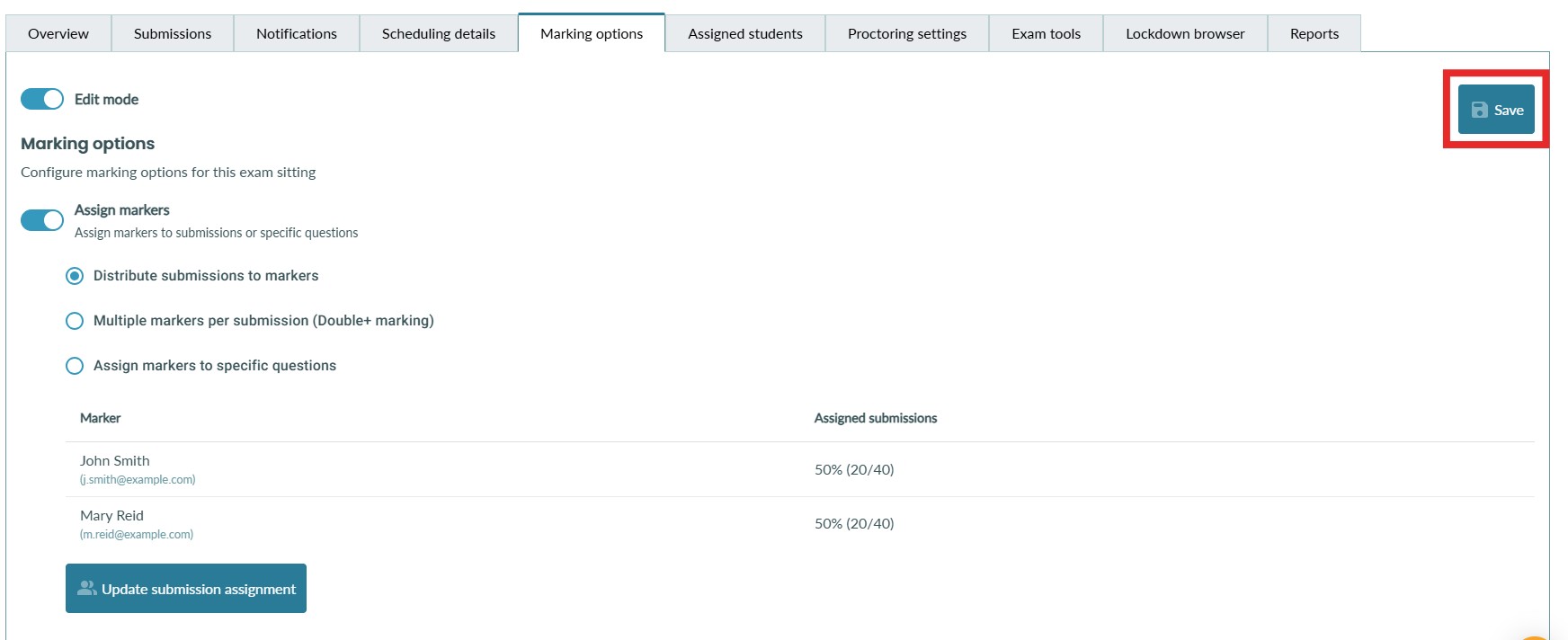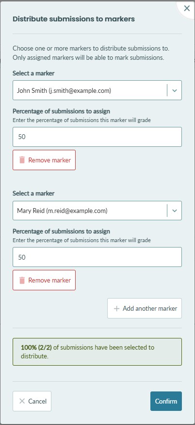 For large exam cohorts, you can assign multiple markers to a sitting and automatically distribute submissions to each marker based on defined percentages. This helps balance workloads and scale marking efficiently across larger teams.