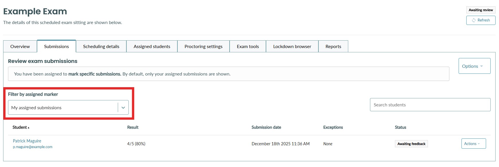 They have the option of using the filter to view submissions assigned to other markers, too. This allows for scenarios where a marker may have an assistant marker and wants to track their progress.