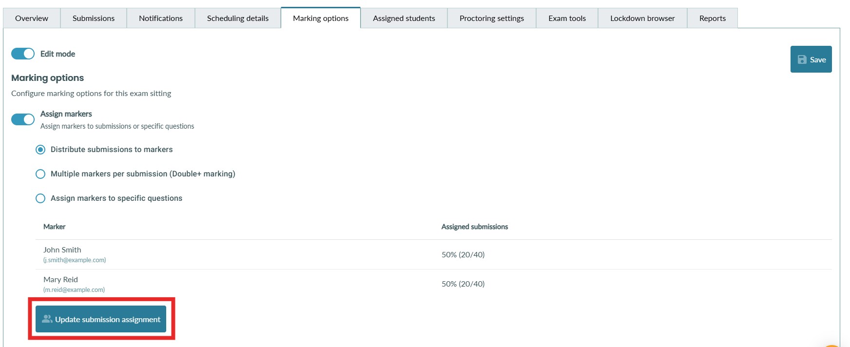 To make updates to the distribution of submissions, navigate to the exam sitting marking options and select 'Update submission assignment.'