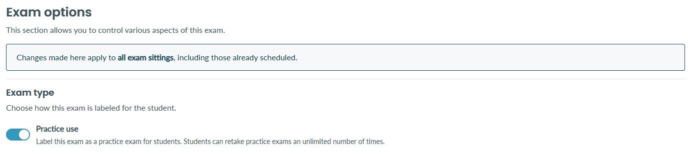 2. Toggle the 'Practice use' option ON inside the Exam type options